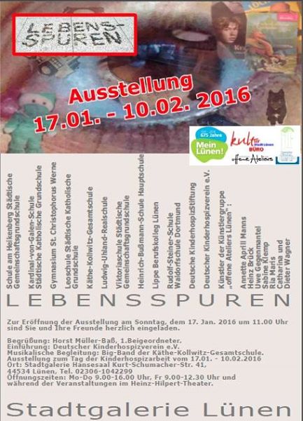 2016.04.21 Text Absage: Liebe Freunde! Leider müssen wir Euch mitteilen, dass die für den 21.5.2016 geplante Kunstaktion in der Innenstadt, sowie die offenen Ateliers am 22.5. aus von uns nicht zu verantwortenden Terminüberschneidungen ausfallen. 2016.01.17 Album: Bilder Mara Jägers zur Ausstellung "Lebensspuren" 2016.01.17: Bild Performance "Himmelsschuhe" von Catharina und Dieter Wagner bei der Ausstellung "Lebensspuren" der Kinderhospizstifung im Hansesaal Lünen. 2016.01.11: Bild L E B E N S S P U R E N